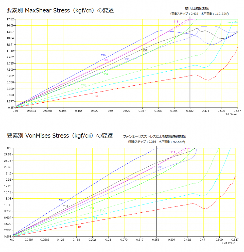 荷重ステップ0.356(水平荷重92.56tf)にて、下部コーナーの要素がσvmに達して降伏した後、応力の再分配を生じ、それぞれの要素が順次降伏する。